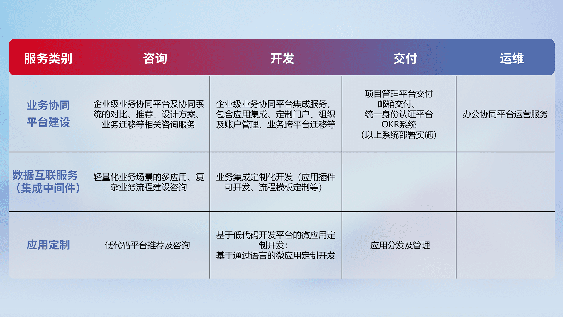 针对钉钉、、企微、、IDaas等平台级产品提供产品的规划、、方案、、、、交付、、定制化开发等服务,,,,实现如统一协同办公、、智能客户服务、、、混合会议管理、、智能数据查询、、、、等业务场景,,,,实现数字化转型。。。